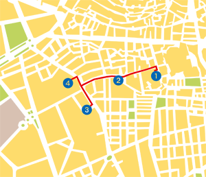 Esta última ruta, que tiene como eje la calle de San Jerónimo muestra al viajero el Monasterio de San Jerónimo; el Hospital e Iglesia de San Juan de Dios; Ia Iglesia de los Santos Justo y Pastor; la Plaza de la Universidad y la Casa de los Vargas. El Monasterio de San Jerónimo se enmarca dentro de la expansión del modelo europeo de capital moderna. Se trata de un soberbio recinto monástico, donde reposan los restos del Gran Capitán, Fernando González de Córdoba. Desde la Catedral y hasta el anterior edifico sale al paso la Basílica de San Juan de Dios, donde se encuentra enterrado este santo. El templo es una espléndida muestra de barroco granadino. Muy cerca se encuentra la plaza de la Universidad, una institución fundada por Carlos V en 1528. En el centro del ágora destaca la estatua del soberano. En esta misma plaza se encuentran la iglesia barroca de los Santos Justo y Pastor, un magnífico edificio de estilo barroco que se comenzó a construir en 1575 y en el que merece ser destacado su altar mayor, decorado por Bocanegra.