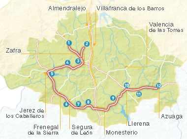 El Señorío de Feria. Tierras TemplariasForman parte de la fisonomía de Zafra-Río Bodión los castillos roqueros que coronan las cimas más sobresalientes de su topografía. Posiblemente no se da en ninguna otra comarca de Extremadura una concentración semejante de fortalezas de primer orden con 4 pueblos declarados Conjunto Histórico-Artístico: Zafra (3) y Feria (1) vinculados al Ducado de Feria, Burguillos del Cerro (4) vinculado a la Orden del Temple y Fuente del Maestre (2) vinculado a la Orden de Santiago. En lo histórico, este territorio es el origen del Ducado de Feria, con la donación realizada en 1394 por Enrique III de Castilla a Gómez Suárez de Figueroa. Dos centros protagonizan de modo principal el recuerdo de los Suárez de Figueroa. Uno es Zafra, bellísima localidad, señorial y cortesana, y en la que merece la pena destacar el Palacio de los Duques de Feria, el Convento de Santa Clara, el Hospital de Santiago y la Colegiata de la Candelaria. El otro es Feria, foco estratégico y guerrero. La Tierra de Barros fue poblada desde época remota, como patentizan los numerosos testimonios de las épocas prehistóricas, prerromana y romana. No obstante, alcanza su mayor florecimiento y significación tras la conquista cristiana en el siglo XIII, época en que el territorio se dividió entre las jurisdicciones de la Orden de Santiago y el Señorío de Feria, por lo que históricamente se repartió entre dos de las demarcaciones más poderosas de Extremadura. Castillos y fortalezasEn Tentudía fue el periodo medieval el que mayor huella dejó en la zona. Su situación de frontera entre los reinos árabes y cristianos durante un largo período queda patente en las construcciones militares, entre las que destacan el castillo almohade en Montemolín (9) y un castillo medieval en Segura de León (6), que data del siglo XV. Este último, residencia de los Comendadores de Santiago, se ha convertido hoy en un espléndido y confortable alojamiento para turistas, donde destaca su impresionante cerca defensiva y la torre del homenaje. Pero es sin duda el patrimonio religioso el que mayor presencia tiene en la comarca destacando, entre numerosos conventos, ermitas y cruceros, el Monasterio de Santa Mª de Tentudía (Siglos XV y XVI) (8) y el Conventual Santiaguista en Calera de León (7), ambos monumentos protegidos. También la naturaleza fronteriza de la comarca de Sierra Suroeste se concreta sobre todo en las fortificaciones y amurallamientos con que se resguardan las poblaciones, de los que hoy día aún perduran algunas interesantes muestras de gran belleza. Son numerosas las construcciones con influencias mudéjar, góticas, renacentistas y barrocas. Jerez de los Caballeros (5), Conjunto Histórico Artístico, es un enclave estratégico sólidamente fortificado, de antecedentes romanos, visigodos y árabes. Su máximo apogeo llegó en el siglo XIII, cuando fue capital del Bailato del Temple, conservándose de aquel pasado esplendor una espectacular fortaleza templaria. La localidad posee también algunas de las construcciones barrocas más hermosas de Extremadura plasmadas en sus cuatro emblemáticas iglesias. La influencia templaria se extendió a Fregenal de la Sierra e Higuera la Real. Estética mudéjarEl visitante de la Campiña Sur podrá disfrutar de un extenso abanico monumental y artístico que parte desde la prehistoria, con importantes restos megalíticos en el término de Azuaga (12); pasa por los romanos (Teatro Romano de Regina) (10); la época medieval (Alcazaba de Reina) y llega hasta la época contemporánea con las magníficas casas señoriales de los siglos XVIII y XIX repartidas por la comarca. Pero será la estética mudéjar la que brilla con más fuerza, acogiendo la Campiña Sur uno de los conjuntos mudéjares más importantes de la Baja Extremadura. Sus influencias se dejan ver en construcciones religiosas y populares, como en las localidades de Llerena (CHA) (11) y Azuaga.