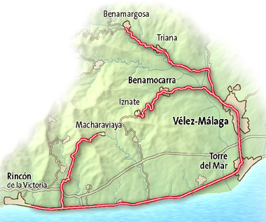 Muy cerca de la capital malagueña y desde el mar Mediterráneo, se encuentra el punto de partida de esta ruta. Recorre gran parte de la Costa del Sol Oriental, desde el Rincón de la Victoria hasta Torre del Mar, donde se interna por una fértil vega de olivos, viñedos y plantaciones de frutas subtropicales. Sin alejarse de la costa, la carretera se interna hasta poblaciones de gran encanto rural como Benamargosa, Benamocarra, Iznate o Cajiz, pequeño pueblo en el que cada Semana Santa tiene lugar una realista escenificación de la vida, muerte y resurrección de Jesucristo. También el Rincón de la Victoria guarda grandes sorpresas, como la Cueva del Tesoro. Pero sin duda, donde se concentra el mayor patrimonio monumental es en la capital de la Axarquía, Vélez Málaga. El actual emplazamiento de la localidad es de pasado profundamente musulmán; la Alcazaba, recientemente restaurada, así lo recuerda. Uno de los lugares con más encanto de la localidad es El Cerro, donde se ubica la iglesia Ntra. Señora de los Remedios, un recoleto templo en el que destacan las pinturas murales de Evaristo Guerra. Numerosos conventos y edificios civiles completan la riqueza patrimonial de su casco antiguo, declarado Conjunto Histórico Artístico. Un último atractivo de esta ruta es la tradición marinera del pueblo de la Axarquía, manifestada en la procesión marinera de la Virgen del Carmen. Coloristas embarcaciones, matizadas por la tenue luz del amanecer acompañan a la Virgen marinera en un espectáculo de gran plasticidad.