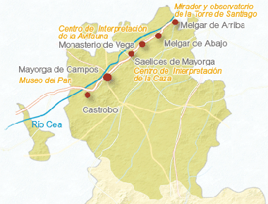 En realidad esta ruta la forman diez recorridos de senderismo de fácil trazado para disfrutar los paisajes de ribera del río CEA. Se trata de una de las rutas más extensas y completas de Tierra de Campos con algunos destacados hitos que merece la pena señalar. De Melgar de Arriba a Melgar de Abajo descubriremos el bosque de ribera y la Cañada Zamorana. En el trayecto de Melgar de Arriba al Páramo, nuestro objetivo, además del simple pacer del paseo, será observar aves esteparias entre las que destaca la avutarda, especie que también observaremos de Melgar de Abajo a Monasterio de Vega o a Santervás de Campos. De Monasterio de Vega podemos transitar hasta Saelices de Mayorga donde contemplaremos una atractiva zona de palomares, o hasta la Dehesa de la Aldea para descubrir allí la Laguna del Rebollar y un roble milenario. De Saelices de Mayorga podemos desplazarnos a Mayorga donde seguimos el bosque de ribera con especies como la Garza o el Ánade Real, o a Izagre para conocer la fauna asociada al Arroyo de la Vega de Izagre, el afluente más largo del Cea. Por último, de Mayorga a Castrobol donde podemos visitar la Granja el Molino y recorrer la Cañada Zamorana.