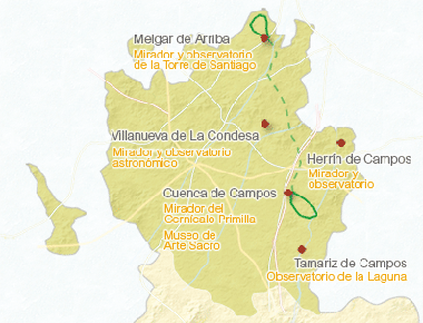 La Ruta Ornitológica de Tierras de Campos consta de dos sendas perfectamente trazadas y señalizadas que nos guían todo el recorrido para que podamos apreciar y conocer mejor las especies que nos vamos a encontrar. La primera transcurre por el término municipal de Melgar de Arriba con avistamientos de especies como aguilucho larguero, ánades reales, cernícalos primillas, avutardas y garzas reales, entre otras. Para visitar la segunda senda debemos trasladarnos a Cuenca de Campos, donde visitaremos el mirador de la colonia de Cernícalo Primilla de la localidad. Este itinerario también transcurre por el municipio de Villabruz de Campos.