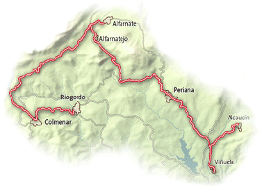 Esta Ruta ofrece la posibilidad de adentrarse en el corazón de la Axarquía y pasar por las laderas de la sierra que limitan a su lado norte: Tejeda y Alhama, disfrutando de un paisaje único. A lo largo del recorrido y en la mayor parte de sus pueblos se pueden ver almazaras, de donde se extrae el preciado líquido. Varias y singulares poblaciones conforman este itinerario. Una de ellas, Periana, tiene a tan sólo 2,5 Km. el Balneario de los Baños de Vilo, en plena fase de restauración, y un lugar privilegiado con aguas sulfurosas de propiedades medicinales. En Riogordo, una singular y hermosa tradición despertará la atención del viajero: el Paso de Semana Santa, donde 400 actores del pueblo escenifican la Pasión el Viernes y Sábado Santos. En misma falda del Pico de la Maroma (2.065 metros) se asienta Alcaucín, en cuyo entorno se encuentra una de las zonas de acampada más bellas de la provincia: El Alcazar. Ya en el límite norte de la Axarquía se encuentran Alfarnate y Alfarnatejo. Cercana a la primera localidad se localiza la Venta de Alfarnate, que data de 1690. Antaño escenario de las andanzas de los bandoleros, esta venta ofrece hoy una exquisita gastronomía en un romántico y bien conservado entorno. Por último, en las bellísimas inmediaciones de la localidad de Viñuela y su embalse se está desarrollando de forma pausada un entorno propio para el disfrute del turismo rural y activo.