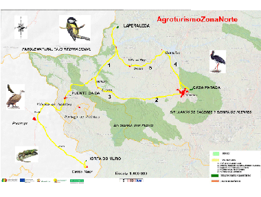 El agroturismo es una forma alternativa de hacer turismo, conociendo de primera mano las actividades agropecuarias, lo que permite descubrir la autenticidad del medio rural y todos los valores que hay en él. De este modo, estas explotaciones agroganaderas abren sus puertas para todas aquellas personas que estén interesadas en conocerlas, ya que, además de proporcionar visitas guiadas a las mismas, ofrecen diversas actividades turísticas relacionadas con la explotación. A todo ello, se une el entorno natural en el que están enclavadas, encontrándonos a lo largo del camino zonas de especial protección como zonas ZEPAS (ZEPA Magasca, ZEPA Llanos de Trujillo, ZEPA Embalse de Alcántara, etc…) zonas ZEPA-LIC como la de Canchos de Ramiro o Río Almonte, entre otras o zonas ZIR como la de Sierra de San Pedro. Sin olvidar la mención que merece el Parque Natural del Tajo Internacional. Unido a la calidad paisajística propia de estos enclaves naturales, cabe destacar la riqueza florística, y sobre todo, la diversidad faunística de los mismos. Entre esta última destacan las poblaciones de aves que habitan en los entornos anteriormente citados, así como aquellas migratorias que llegan durante los meses de inviernos, proporcionando una opción muy interesante en cuanto al turismo ornitológico. Estos son sólo algunos ejemplos de los paisajes que alberga la ruta.