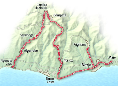 Algarrobo-Costa y Torrox Costa albergan gran parte de la oferta de turismo de playa de la zona, con infraestructuras que ganan cada año en calidad, como el recientemente inaugurado Paseo Marítimo de Torrox. No obstante, donde el desarrollo turístico es sin duda más acusado es en Nerja. Esta hermosa localidad costera posee un rico patrimonio arqueológico y monumental, aunque sin duda lo que más llama la atención son sus mundialmente conocidas Cuevas de Nerja. Cuando la ruta se adentra por el interior discurre entre poblaciones de claro sabor rural, cuyo denominador común se resume en calles estrechas y empinadas de trazado recoleto, que dan fe de su antiguo pasado musulmán. Luz, paredes blanqueadas y flores completan la bellísima estampa de cada uno de estos pueblos. Un ejemplo es Frigiliana, encantadora localidad cuyo casco urbano morisco múdej ha sido premiado en varias ocasiones por su excelente estado de conservación. En esta zona de viñedos merece ser destacado Canillas de Albaida, cuyos vinos son de los más apreciados de la comarca. También Cómpeta, que celebra cada agosto su Noche del Vino, momento mágico cuando miles de personas suben hasta sus 636 metros de altitud a beber, cantar y bailar. Este año Cómpeta brilla con luz propia ya que celebra su Año Santo Jubileo, siendo la primera localidad andaluza en ostentar este privilegio. Pero sin duda, una de las festividades más singulares de la ruta es la Fiesta del Níspero, en Sayalonga, el sentido homenaje de todo un pueblo al fruto que le da riqueza.